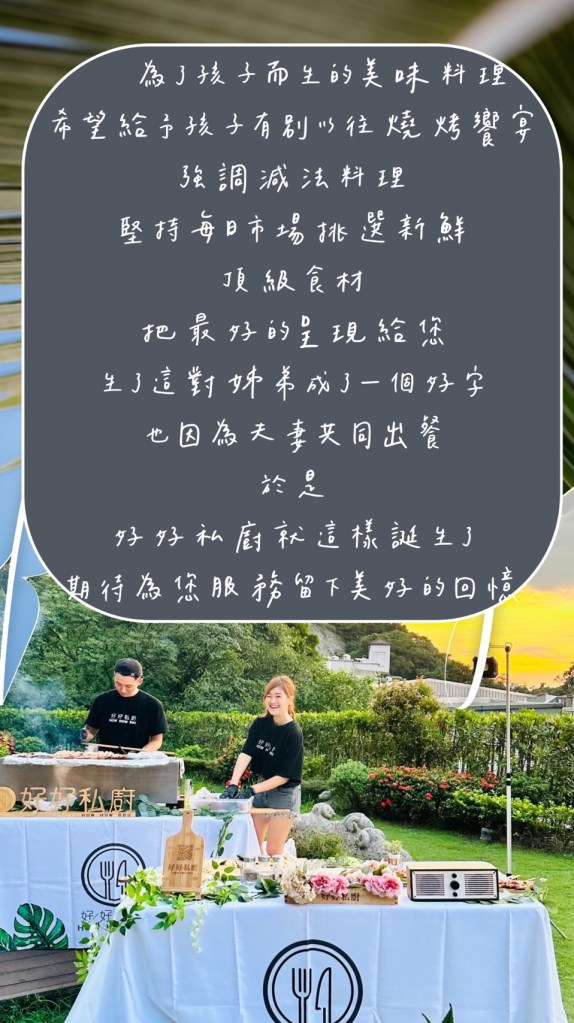 宜蘭民宿專業外燴-好好私廚 HOWHOWBBQ、讓您聚會不用再動雙手,提供專業燒烤餐車服務到府烤肉,儀式感的出餐模式,嚴選頂級新鮮食材,無論是家庭聚會、周歲派對、生日派對、求婚派對、公司團聚或民宿包棟推薦、精品活動,好好私廚專業代烤,給您不一樣的私廚饗宴。